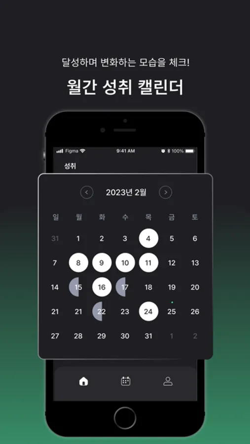이번주 나의 달성률과 이번달 나의 달성률을 캘린더를 통해 편하게 확인할 수 있어요!