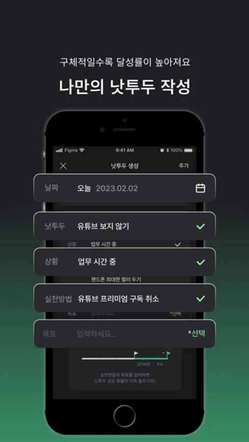 낫투두를 달성하기 어렵다면, 실천방법과 목표 작성을 통해 쉽게 달성해보세요.