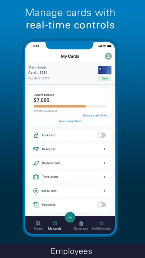 -- Real-time card controls, including locking and unlocking a card, resetting PIN, reporting a lost/stolen card, establishing spending limits and enabling merchant category restrictions