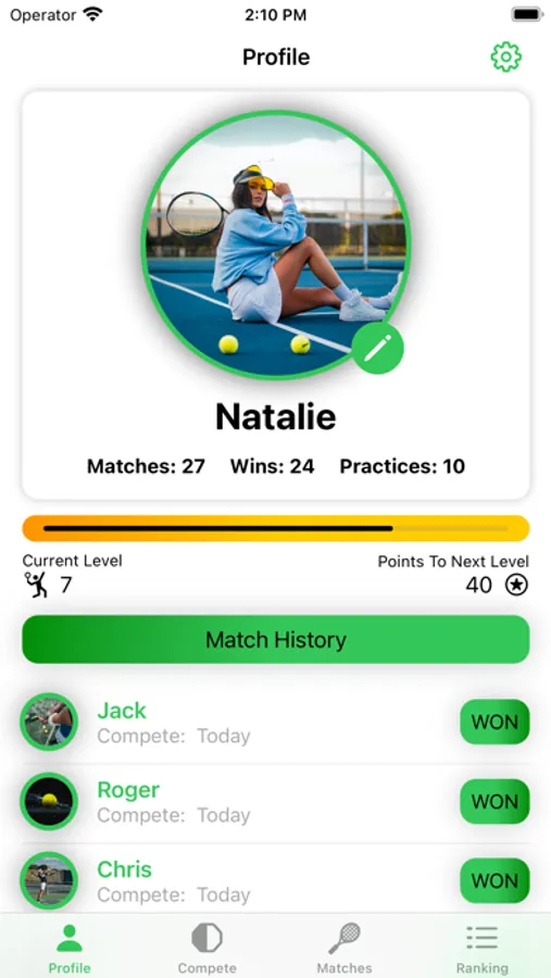 Slam is a mobile app that gamifies the experience for playing tennis. It allows to keep track of your progress and compare yourself within the rankings.