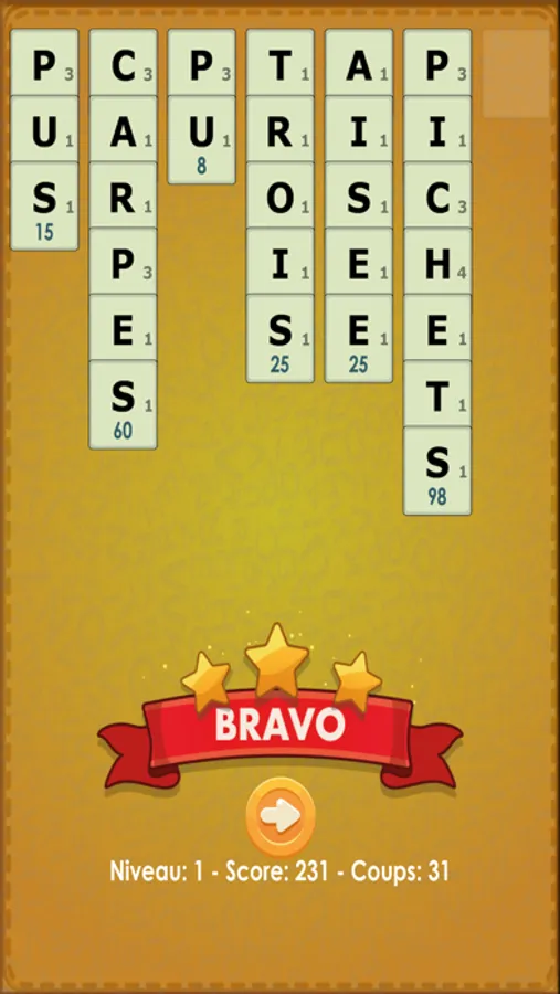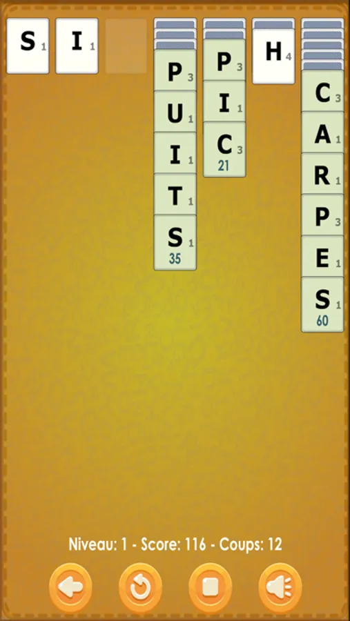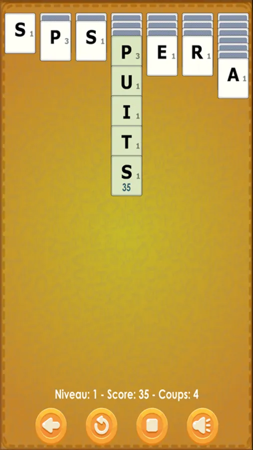 7 piles de cartes recouvrent votre tapis de jeu : A vous de les superposer afin de créer des suites de lettres qui composent des mots.