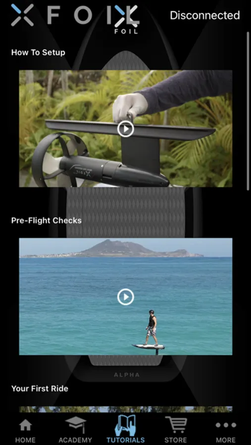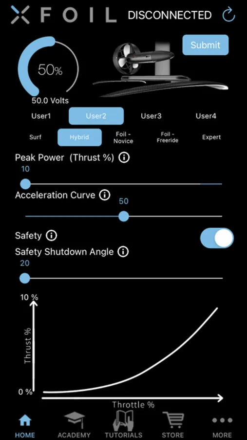 XFoil App connects to the XFoil Hydrofoil board via Bluetooth LE interface. This app allows you to customize and tune your user settings by adjusting the displayed user name on the remote control, set maximum delivered motor power, throttle curves, safety features and more. The app also includes a library of training and tutorial videos, online store links, manuals, and information where to obtain customer support.