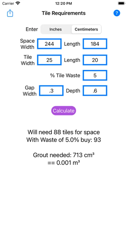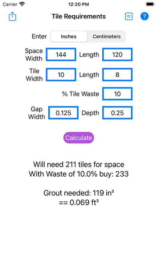 Estimates the grout volume required and can consider any tile waste when installing.