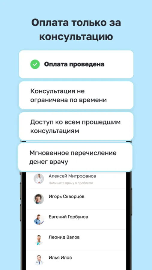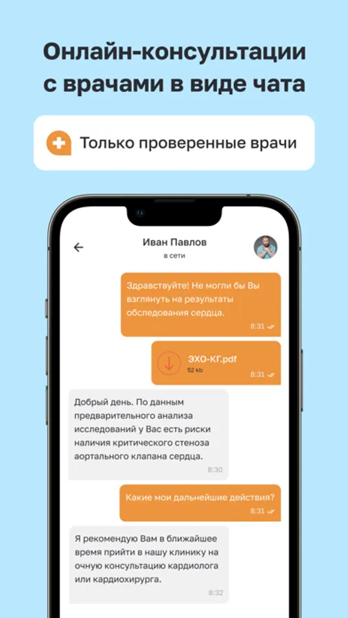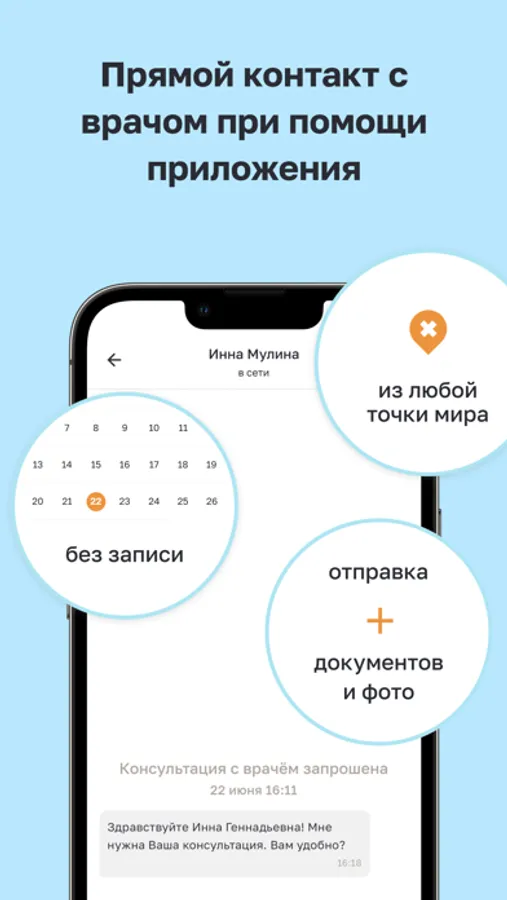 - Врач ведёт коммуникацию с вами в отдельном приложении, что позволяет концентрироваться на вашем вопросе.