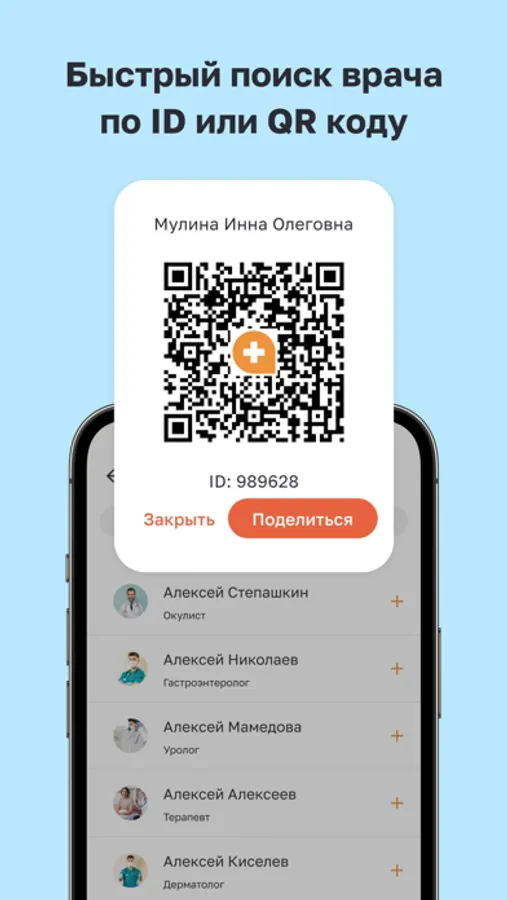 - Вы сообщаете своим пациентам только свой id в виде номера или QR кода.