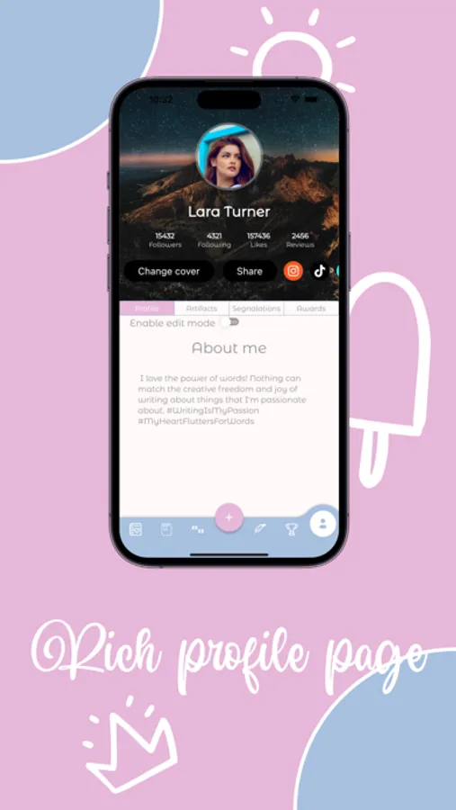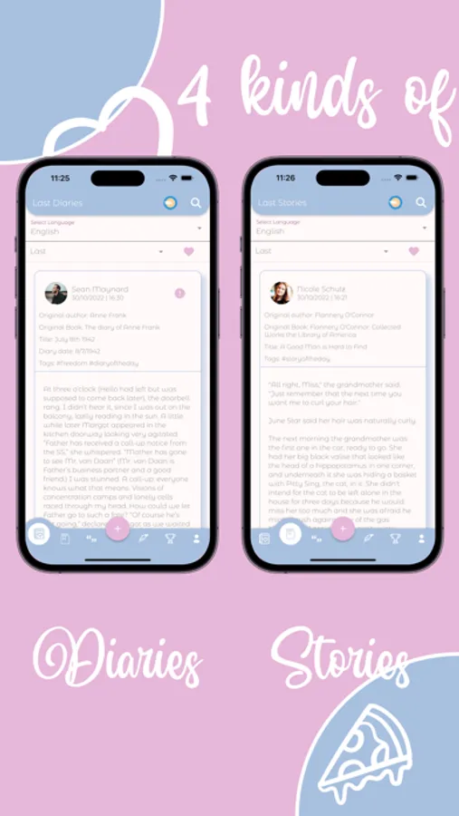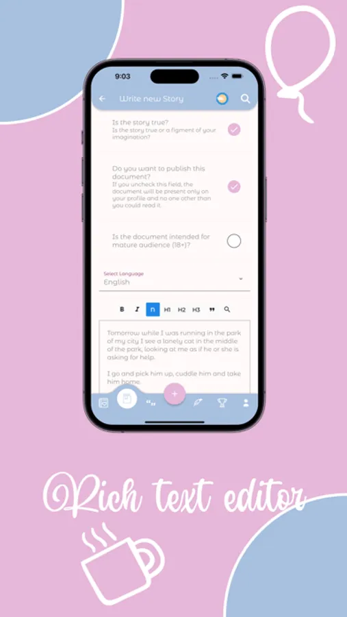 This app allows users to read or write 4 different types of documents, journals, stories, quotes and poems through a rich text editor. Each section is divided by language so that each user can use the language they prefer or improve the idiom they are studying. There is a profile page where you can link your social networks, view your followers or users we follow and read comments other users may have left on our profile. There is a trophy system, specifically each day, week and month the documents that have received the most likes for each language and type of document will be chosen. To avoid problems in using the app there is a tutorial section where the main features are described in detail and it is also possible to send a direct message to the developer so that he can correct any problems.