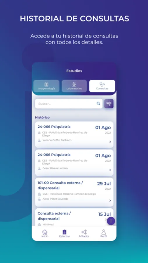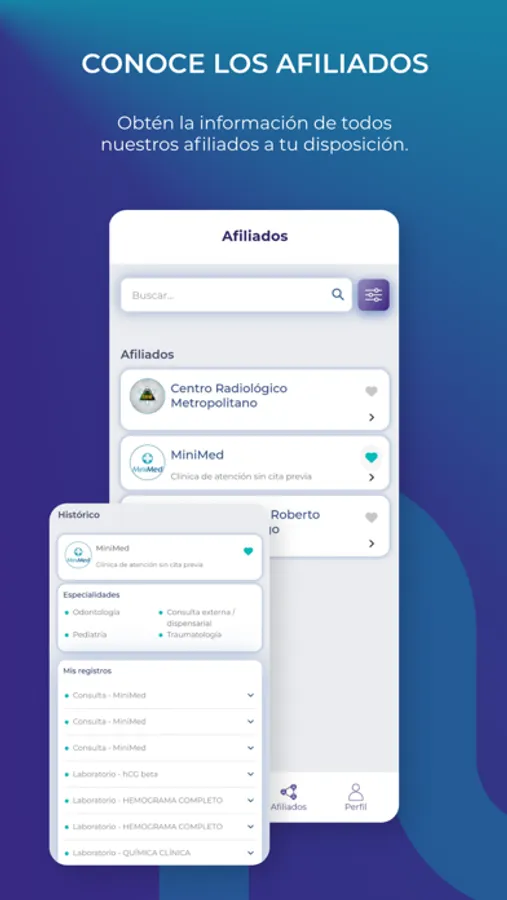 Acceder en cualquier momento a sus datos de salud e historial clínico de forma rápida y segura. Desde BIENI se podrá consultar estudios de imagenología, laboratorio y consultas médicas de los diversos afiliados.