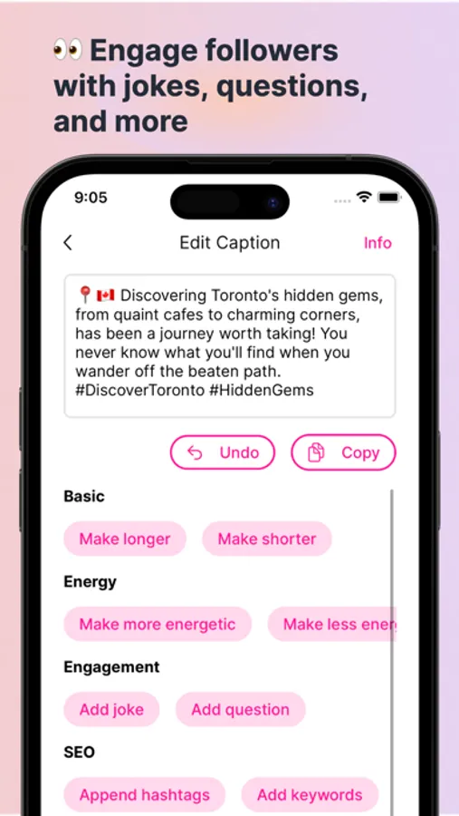 Our app lets you choose your persona, tone, and topic to create captions and hashtags that feel authentic and captivating.