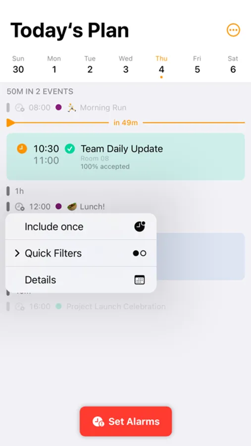 Create filters with custom rules to include or skip calendar events, then set alarms for included events in your day's schedule!