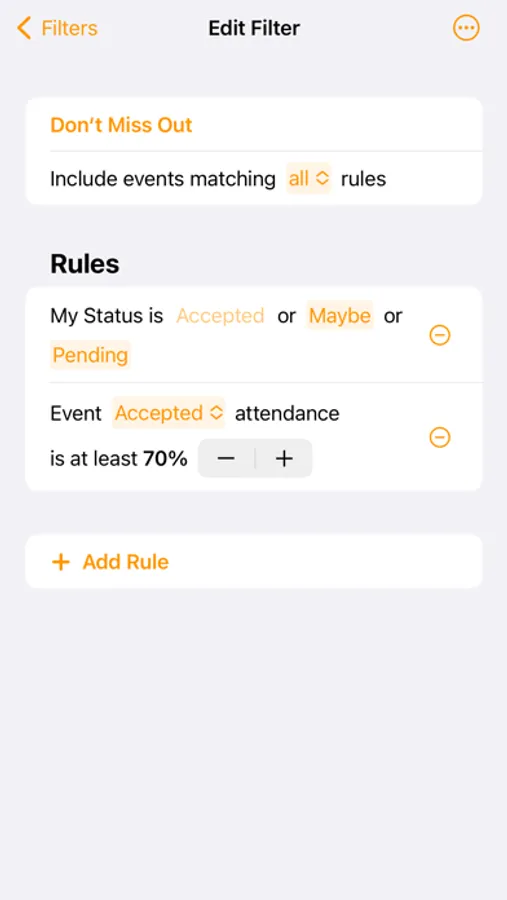 ▸ Pair My Status and Attendance rules to create a filter that helps you catch events you may have forgotten where most people are attending.
