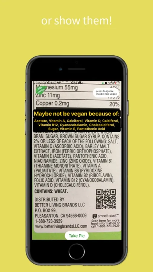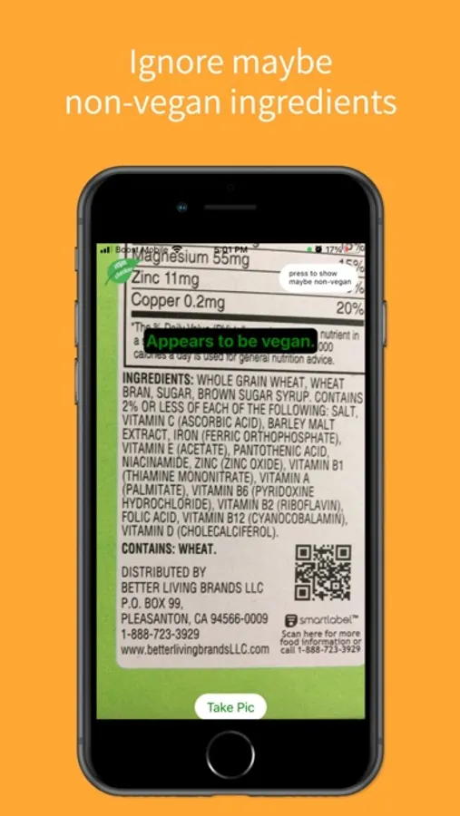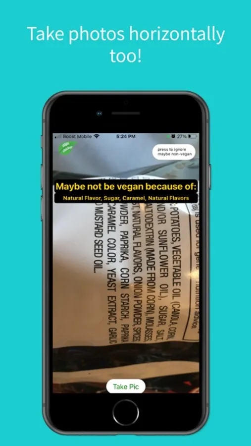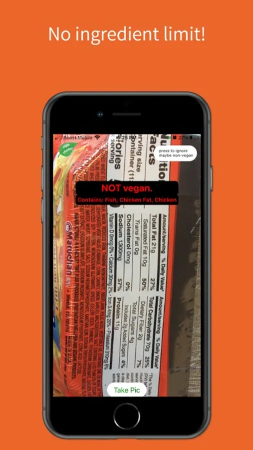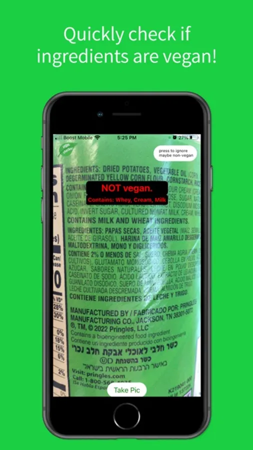 Quickly check if any list of ingredients (food, cosmetic, etc.) in English has any animal derived ingredients! Includes ingredients that may not be vegan depending on the source, but these ingredients can be hidden. Over 300 ingredients checked for. No data collected, just take a photo and see the result!