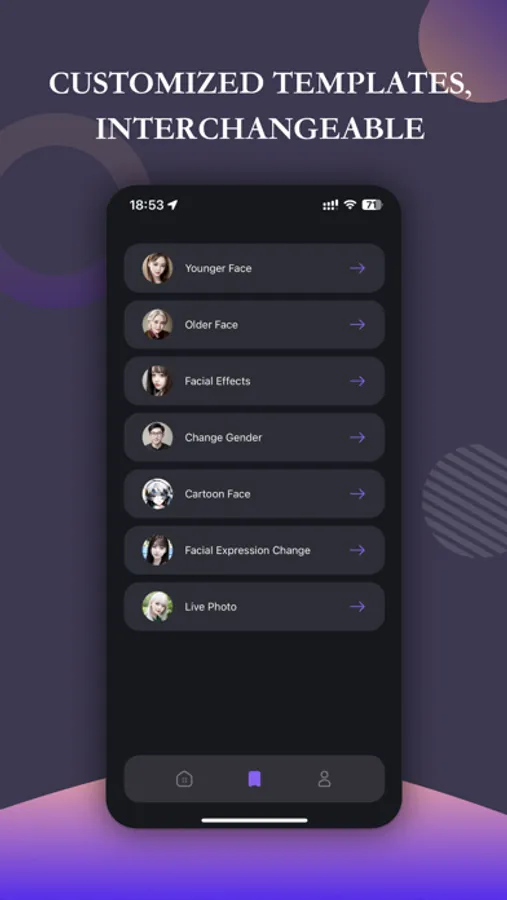 Experience various face swapping effects such as "Become Younger", "Become Older", "Cartoon Face", "Gender Transformation", "Change Facial Expressions", "Face Special Effects", and "Change Hairstyle"!