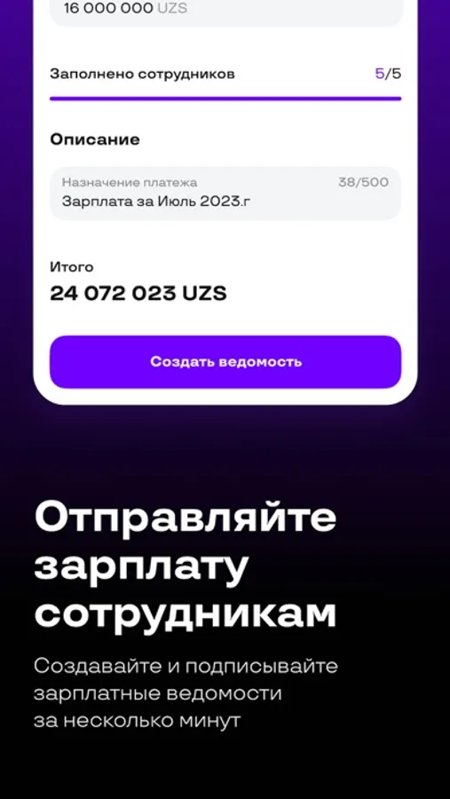 Создайте зарплатную ведомость, заполните суммы выплат и подпишите платёж. Зарплата будет зачислена сотрудникам в тот же день.