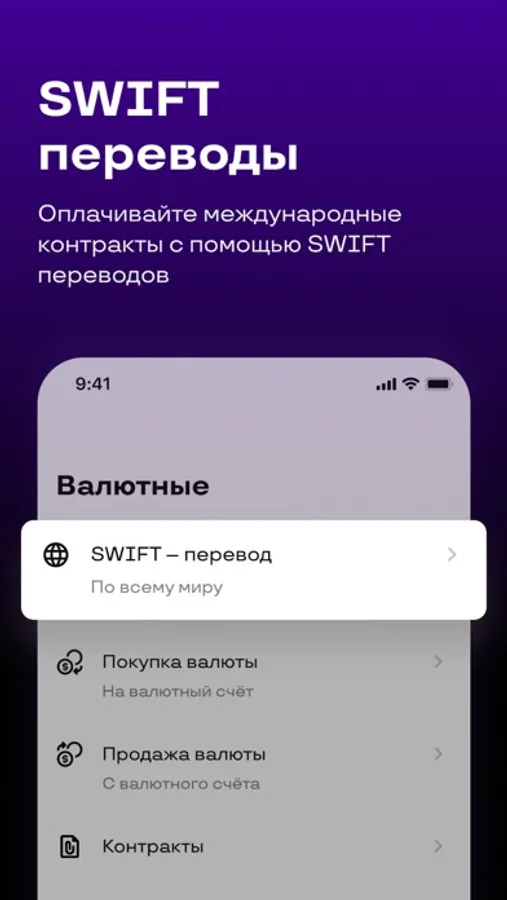 Отправляйте swift-переводы, обменивайте валюту и просматривайте информацию о валютных контрактах.