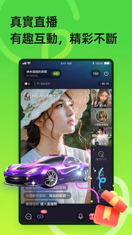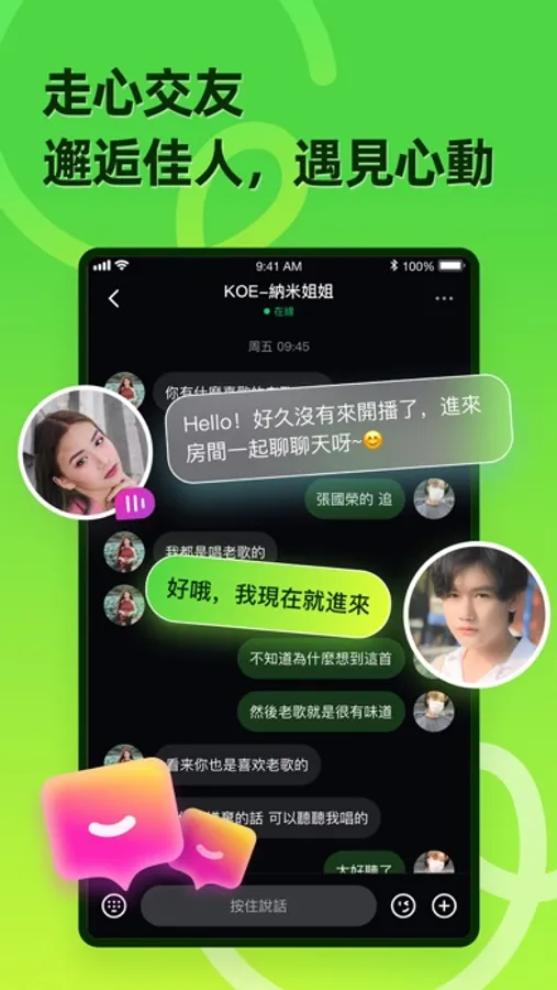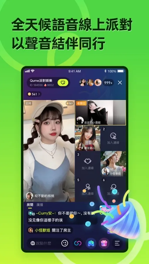 多人線上語音派對,輕鬆結交新朋友;一起聽歌、遊戲、聊天、陪伴、連麥處CP!花樣派對玩法,專業才藝表演、優質聲音互動,讓你的生活更有溫度!