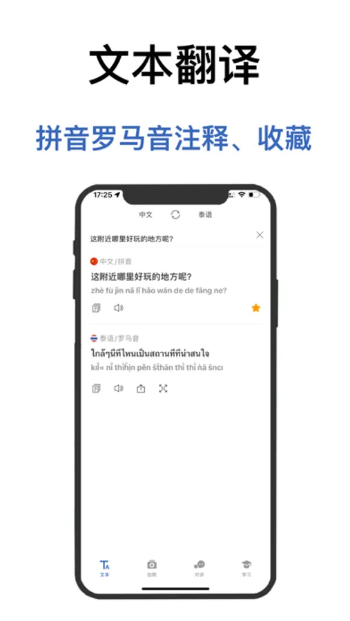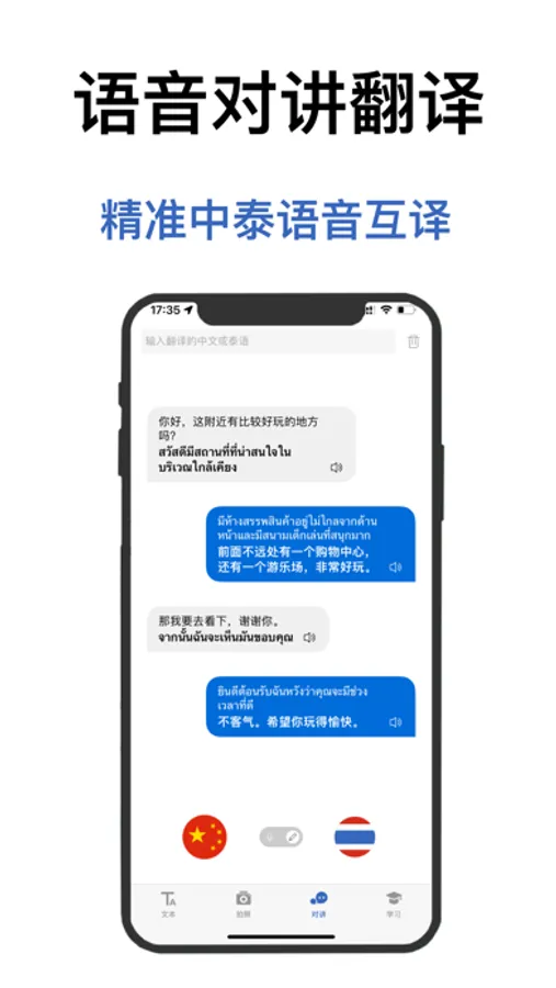 特别受泰国旅游的小伙伴的喜欢,支持中泰文对讲互译,准确的把语音转化为文本,快速翻译成中文(泰文)。