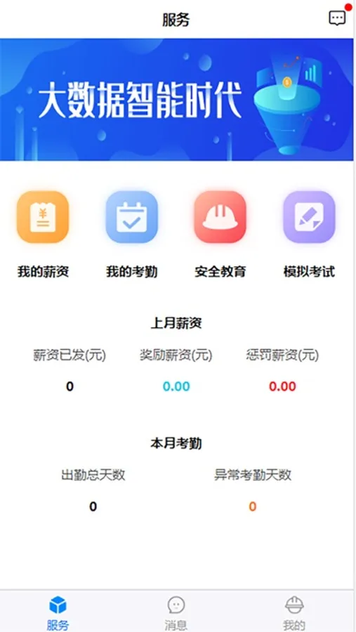 功能模块包括:我的薪资,我的考勤,安全教育,模拟考试