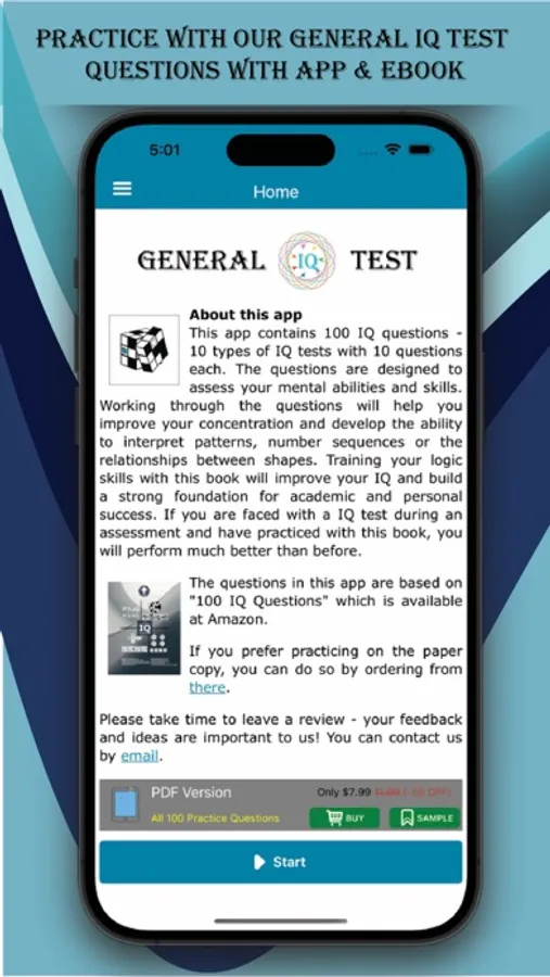 This app contains 100 IQ questions - 10 types of IQ tests with 10 questions each. The questions are designed to assess your mental abilities and skills. Working through the questions will help you improve your concentration and develop the ability to interpret patterns, number sequences or the relationships between shapes. Training your logic skills with this book will improve your IQ and build a strong foundation for academic and personal success. If you are faced with a IQ test during an assessment and have practiced with this book, you will perform much better than before.