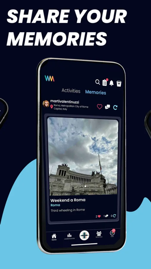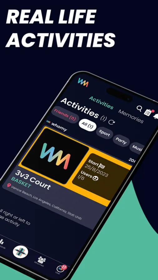 Choose from many categories, create your own personalized activity and give interested users the opportunity to join. Start the activity and enjoy your experience. By completing it you will get Whomy points, gems and the possibility to create a Memories.