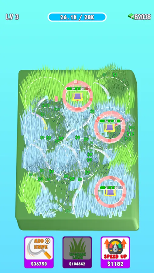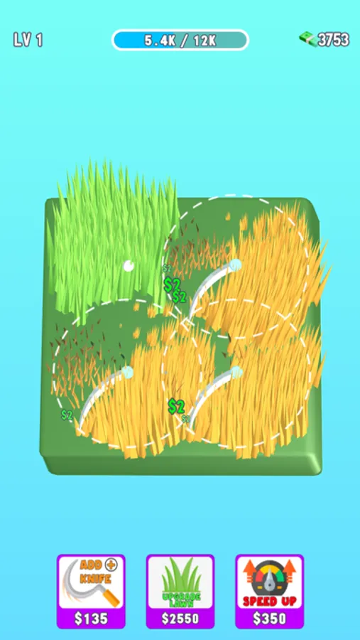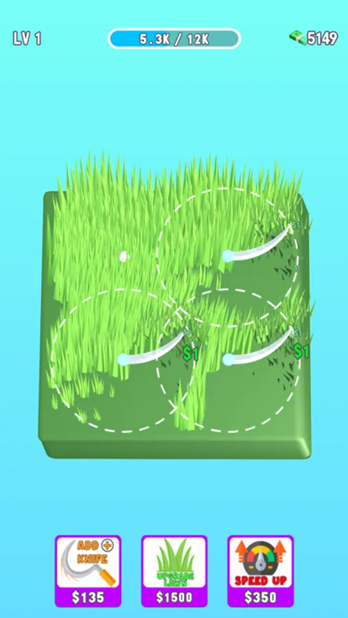 Add blades to mow the lawn faster! Break the bricks on the ground and collect special blades. Upgrade your grass and speed up blades to earn more money.