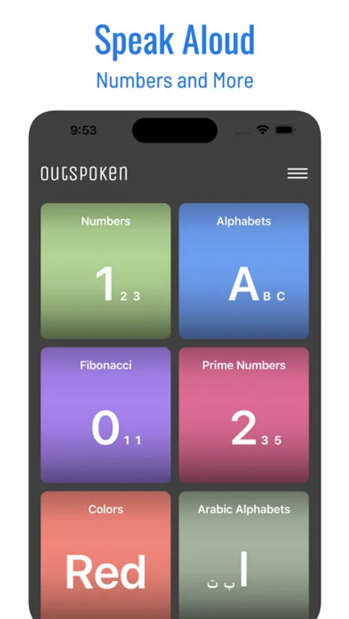 Whether you're doing a workout, teaching your child how to count or learn the alphabet, or even learning a new language or subjects like roman numerals and the periodic table elements, OutSpoken is here to help you out.