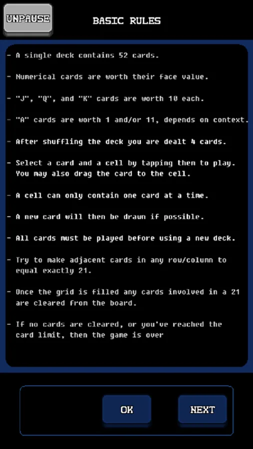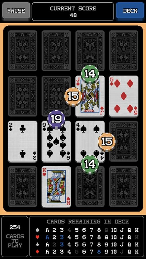 21 Skidoo brings a new twist to the classic game of Blackjack. In this card counting puzzler you'll add cards together in any direction to make 21. Fill the entire board without any 21s and you'll lose. Challenge yourself now with this simple and addictive card game. Can you make it through an entire deck? How about 5?