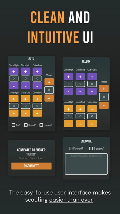 TigerScout is an easy, open source cloud-integrated scouting app made by Team 4829 - The Titanium Tigers. It allows for simple and objective scouting, along with useful statistics for strategizing and alliance selection. Firebase cloud integration allows for seamless data syncing, without having to worry about QR codes or CSV files. For further information, please visit https://github.com/iBrushC/4829TigerScout, or contact the app's creator, Andrew Combs, at mrandrewcombs@gmail.com.