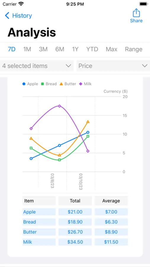 This App allows you to create a list to track your activities, tasks, or events. This App typically tracks your grocery shopping at a specific shop and every shopping event over time. The list-event can be moved to history for future reference and trend monitoring. When a list is moved to the history, a snapshot is taken and saved to history. Another example of list usage could be tracking monthly expenses. A list item could be the different expense heads, and a column can be added to enter the money spent in that head every month. When a list is filled for a month, it can be sent to history. After accumulating the monthly expense data, it can be analyzed using the charts this App generates.