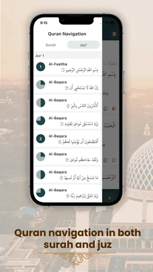 - Easy navigation between Suras, Juz' and Quarters.