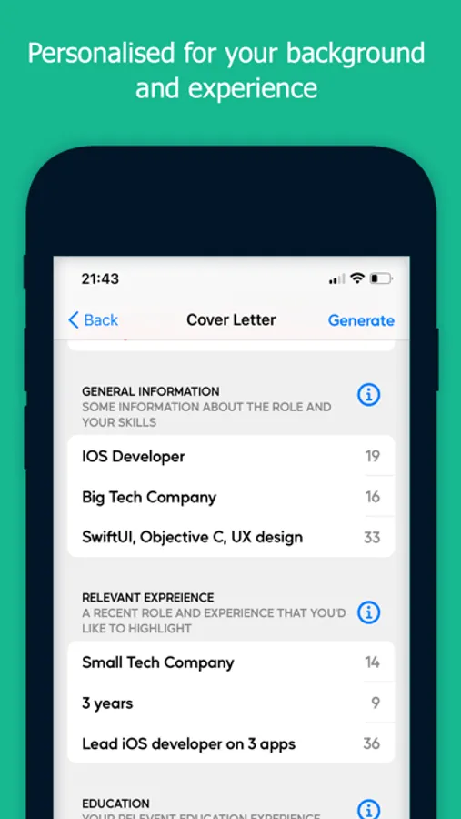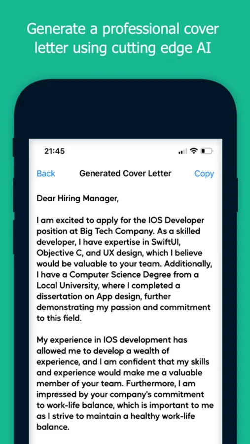 Introducing Easy Cover Letter - the AI-driven app that helps you create the perfect cover letter for your job application. Create a cover letter quickly and easily without having to worry about the wording and formatting. Using GPT's generative AI, Easy Cover Letter takes into consideration your past experience, the job requirements and the criteria hiring managers are looking for - so you can be confident that your letter is tailored to the position. Perfect for those who don't have time to spend writing multiple cover letters or lack the confidence to create the perfect one. With Easy Cover Letter, you have one less step in your job search.