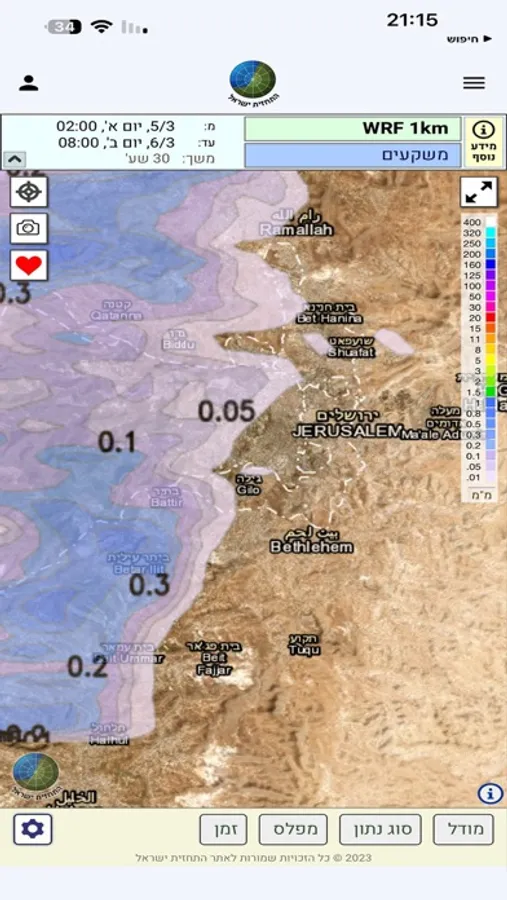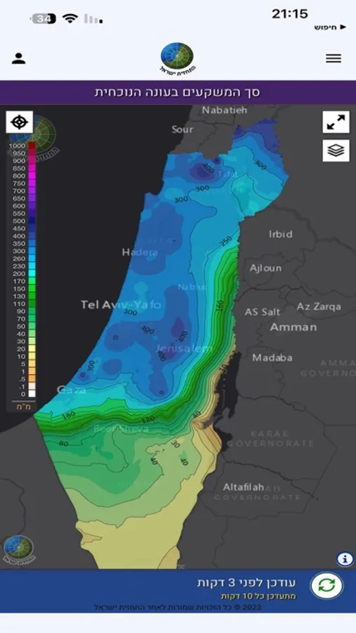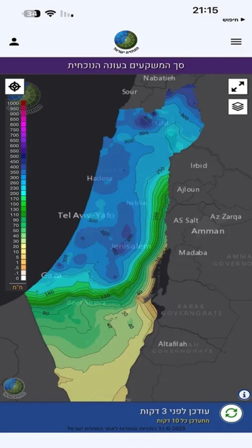 In addition, you will find our flagship project, code name "Suzie" - presenting current data in colored heat maps, showing the accumulated amount of precipitation for short and long ranges, starting at rain accumulation in the last hour, up to seasonal accumulation. The two-dimensional map is created by sophisticated interpolations of current data from hundreds of meteorological stations: IMS stations, the Ministry of Agriculture, the Water Authority, and privately owned stations.