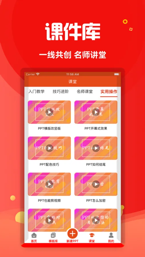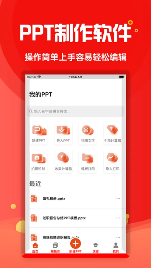 支持电脑导入、本地导入等多种方式导入PPT文件。 提供多样的教学课堂,让你不断学习制作技巧,变身幻灯片制作达人! 提供多个实用功能:扫描文字、文字拍照、个税计算器、收款计算器、模板打印等,满足你的办公需求!