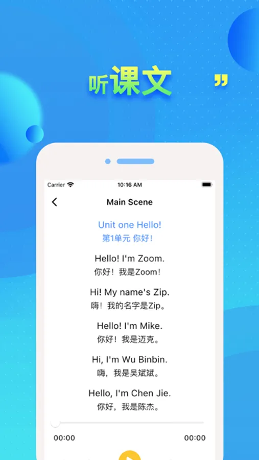 同步课本各单元听力,音频。与单纯音频播放不同,增加语速调整,中英文对照,播放进度控制声音播放与文本同步。