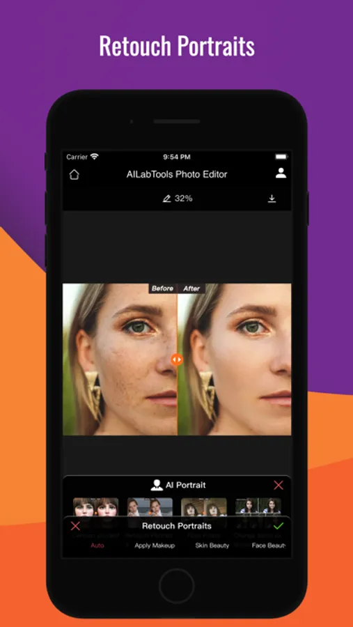 Retouch Portraits - Automatically evens out face areas, removes blemishes (acne, pimple marks, freckles, etc.) and whitens skin areas all over the body while retaining as much skin texture as possible through AI algorithms. Multi-player image processing is supported.