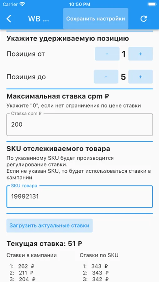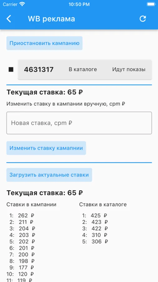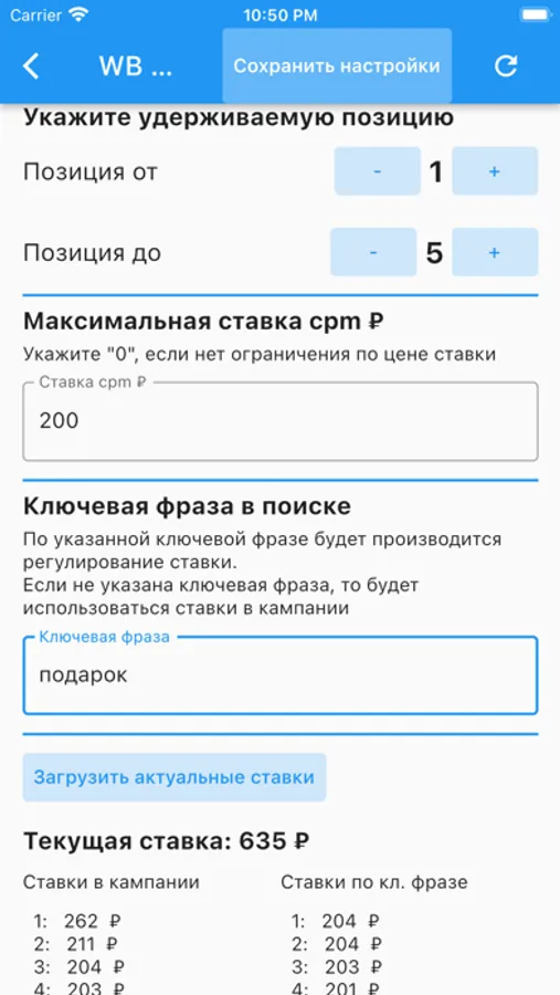 Удобный доступ из приложения для просмотра и изменение ставок WB и реальных.