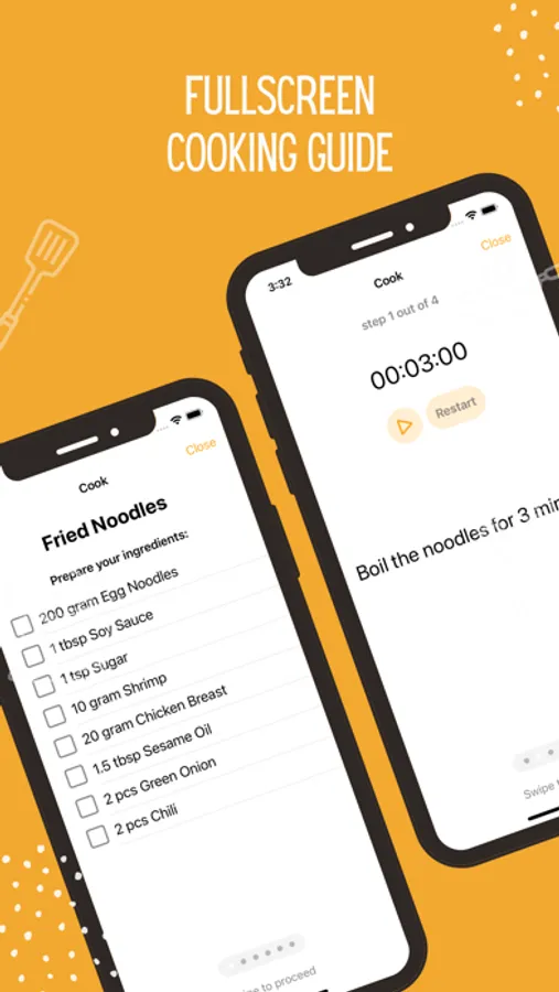 Search recipe you want to cook. Use "cook" mode to start the full screen cooking helper: checklist for your already prepared ingredients and step by step guide with timer.
