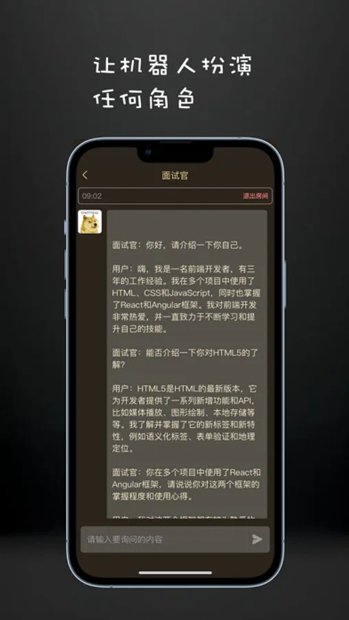 支持不同类型的机器人扮演玩法,例如AI面试官、心理健康顾问、小说家、基于文本的冒险游戏、医生等等