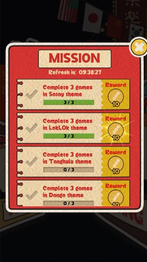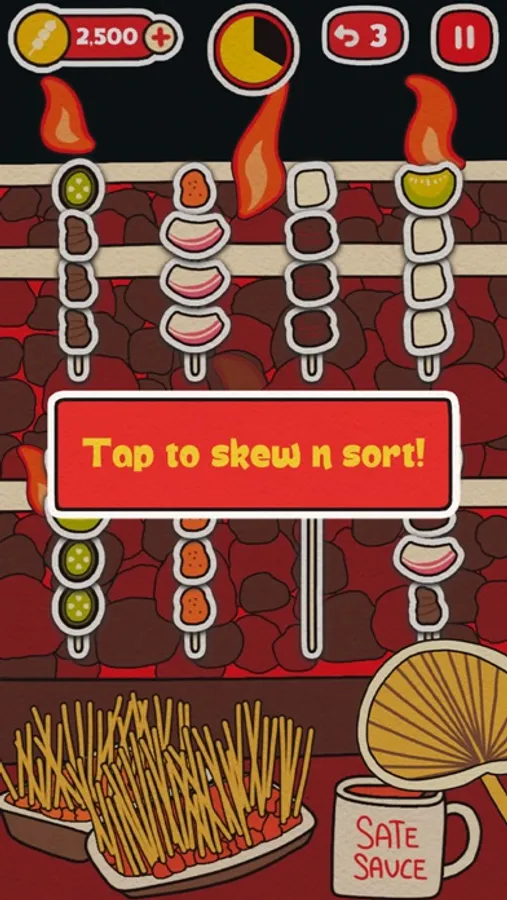 With every completed level, the difficulty increases. Depending on the difficulty you’ve selected, you must complete the puzzle before the timer runs out. More street food items will be introduced. You’ll also need to be careful in choosing which food items to sort first. You can only move the same type of food on top of each other. If you choose the wrong food to sort first, then you might be stuck, and it will be game over! Solve the level by the most optimal sorting sequence of the food items into its skewer, and you’ll score 3 stars at that level. Complete all the puzzles with 3 stars for that perfectionist satisfaction!