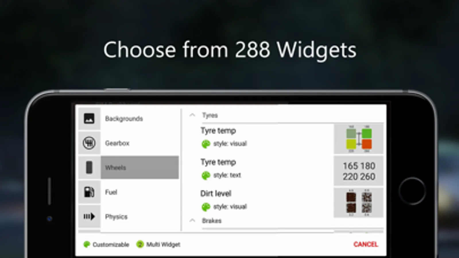 • Choose from a large number of widgets like analog displays, gear indicator, fuel usage, lap times, RPM LED Bars and many more