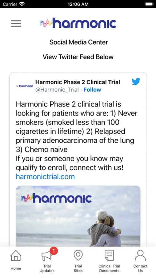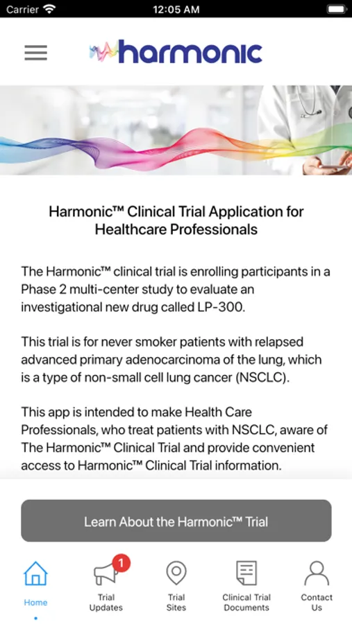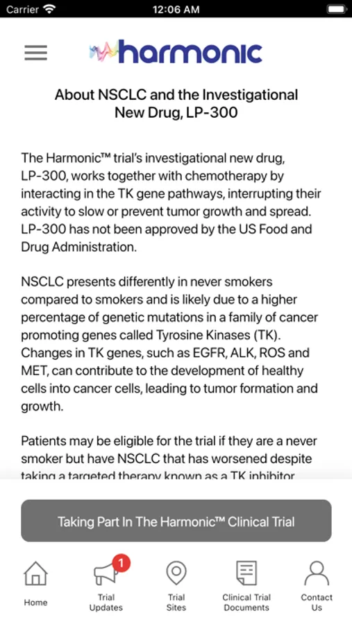 Patients can not enroll in the Harmonic™ Clinical Trial through the app. To enroll in the Harmonic™ trial, they will need to involve their clinician or oncologist and be available to routinely visit and be treated at a cancer center that is involved with the Harmonic™ Clinical Trial. The app is intended to make healthcare professionals aware of NSCLC and to learn more about a clinical trial in this therapeutics space.