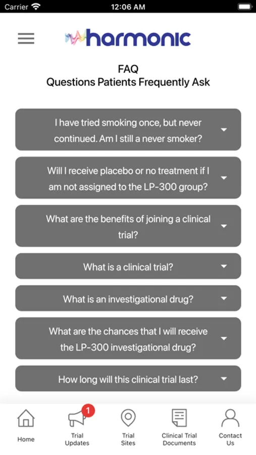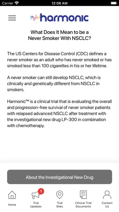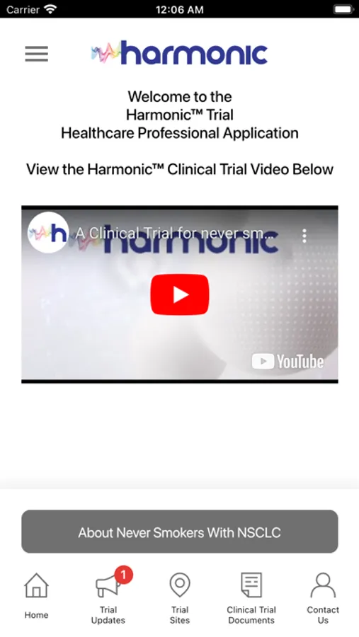 The Harmonic™ Clinical Trial application allows users to learn about NSCLC (Non-Small Cell Lung Cancer). Users of the app can contact the Harmonic™ Clinical Trial Team for more information. Users can download or read documents detailing the Harmonic™ Clinical Trial information. The app includes an informative video about Non-Small Cell Lung Cancer and to learn more about the Harmonic™ Clinical Trial. The application has a very informative FAQ (Frequently Asked Questions) section that helps answer key questions about the Clinical Trial.