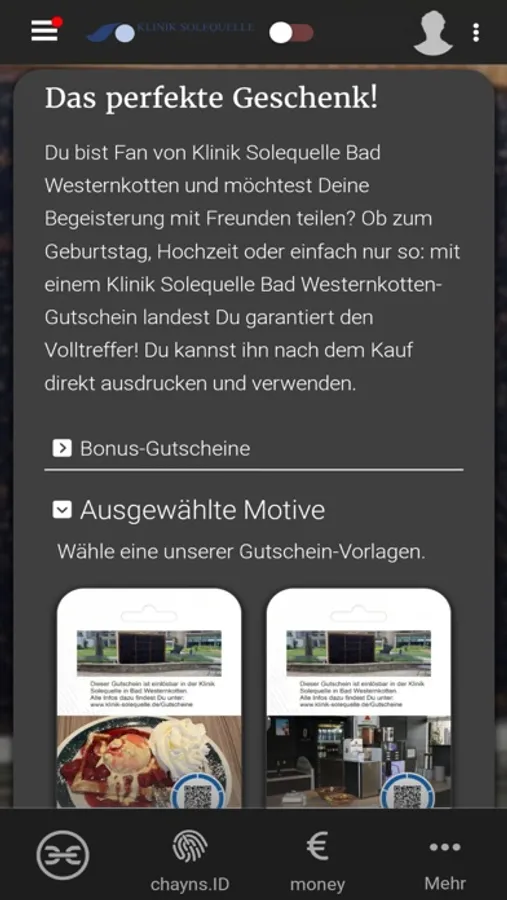 Nutzen Sie durch die APP unsere bargeldlose Bezahlfunktion in der Cafeteria oder beim Einkauf von Hilfsmitteln und Hygieneartikeln. Der Erwerb und die Versendung von Gutscheinen ist ebenfalls möglich. Neuigkeiten zu Vorträgen, Workshops und Freizeitveranstaltungen aus erster Hand verhelfen Ihnen während des Aufenthaltes bestens informiert zu sein.