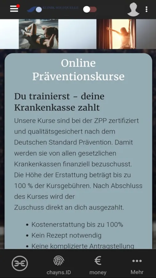 Von der während des Aufenthaltes erzielten Erfolgen sollen unsere Patienten nachhaltig profitieren. Bekannte Bewegungsübungen im Videoformat sollen das Nachmachen erleichtern und somit Hemmschwellen senken, den Körper weiterhin in den Bereichen der Mobilisierung, Kräftigung, Dehnung und Koordination zu trainieren. Auch nach der Reha können Entspannungseinheiten wahrgenommen werden. Über Audio- und Videoaufnahmen, die von unseren Entspannungstherapeuten gesprochen werden, können sich App-Nutzer bei Atementspannungen und Visualisierungen zurücklehnen und die Therapien ganz einfach zu Hause fortführen. Auch das umfangreiche Angebot an Präventionskursen für zu Hause bietet einen Mehrwert für den APP Nutzer.
