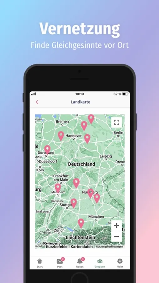 Online finden – Offline verbinden! Du kannst freiwillig Deinen Standort angeben, um auf den Landkarten in den Gruppen sichtbar zu sein. So kannst Du andere Gleichgesinnte in Deiner Nähe finden.