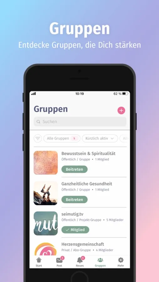 Entdecke Gruppen, die Dich stärken. Finde Gleichgesinnte in Deiner Nähe. Bewege Großes mit Deinen Ideen!