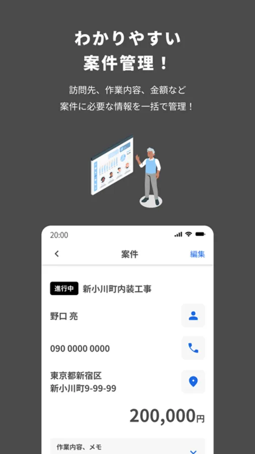 訪問先の住所、作業内容、料金など各案件の情報を管理することができます。施工が数日かかる案件も簡単に設定でき、施工によって誰が担当かも管理ができます。
