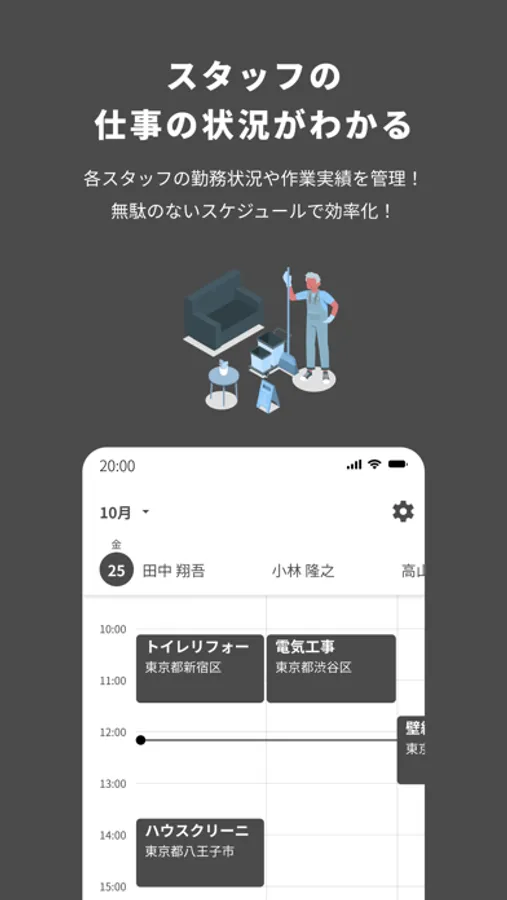 各スタッフの勤務状況や作業実績、スケジュールなどを管理することができます。