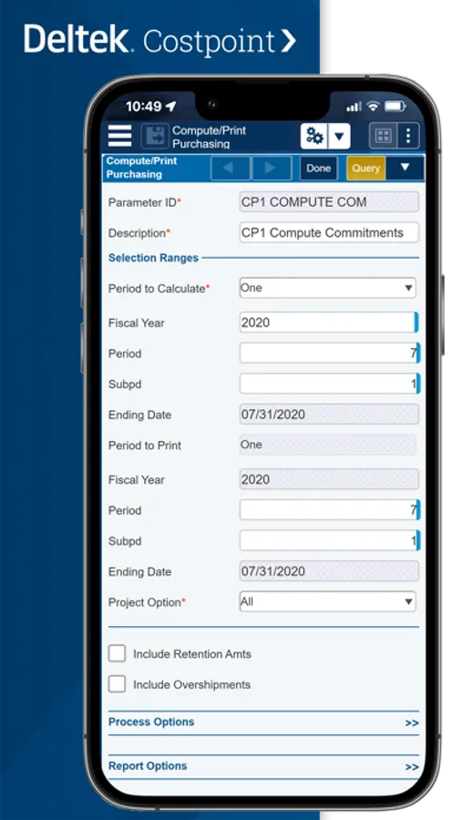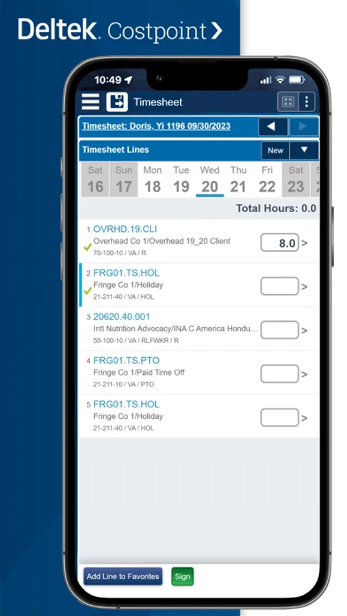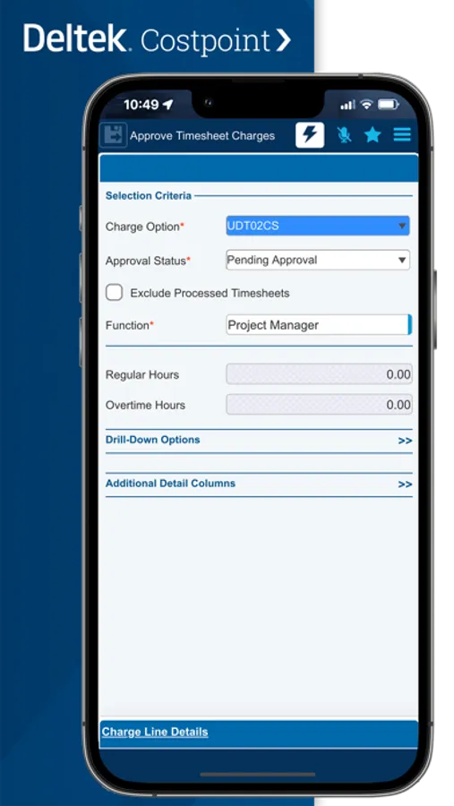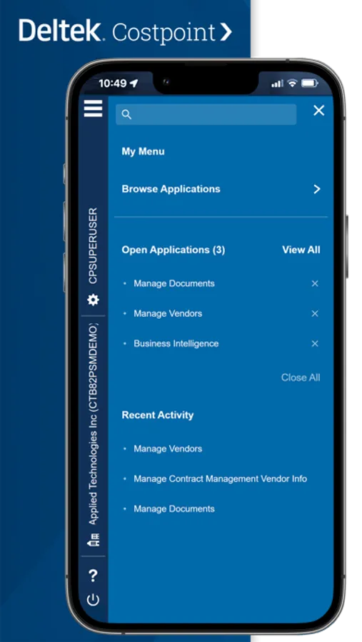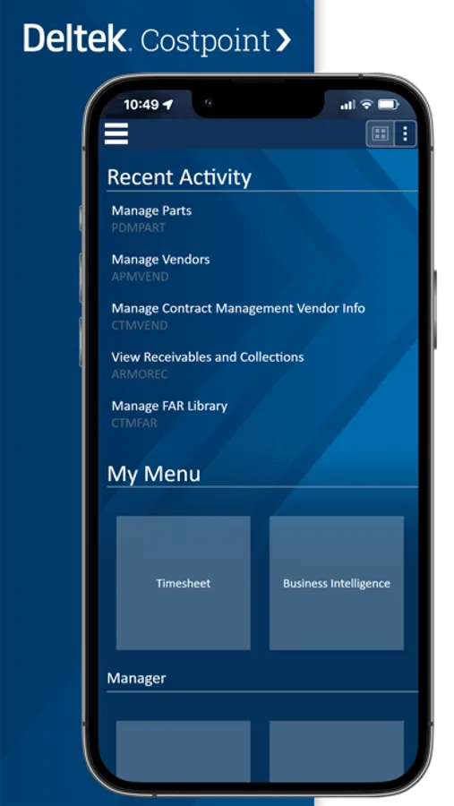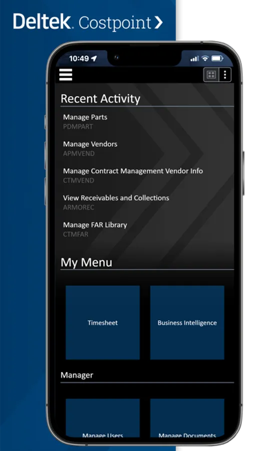 Deltek Costpoint mobile app offers access to all of the same functions/applications in Costpoint that a user would otherwise have access to through the browser – Enter/Approve Time, Voucher Approval, adding an employee, or any other domain/function within Costpoint. All security/authentication options available in Costpoint on a laptop are supported, including built-in device biometric authentication. Any extensions built for Costpoint, including UI extensions with new fields or new screens, are supported out of the box as well.