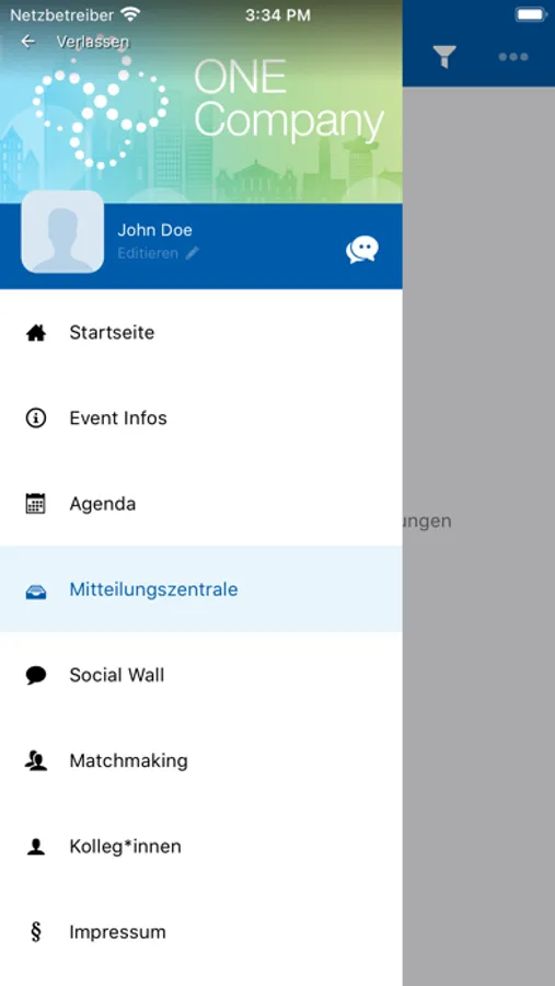 Alle verfügbaren Events werden in einer Übersicht aufgelistet und können für nähere Informationen ausgewählt werden. Zu den Inhalten gehören u.a. Agenda und Konferenz-Pläne sowie Sonderseiten zu Event-relevanten Themen. Nutzer können im Newsfeed posten, ihre Workspaces und Sessions sehen, und wer mit ihnen teilnimmt.