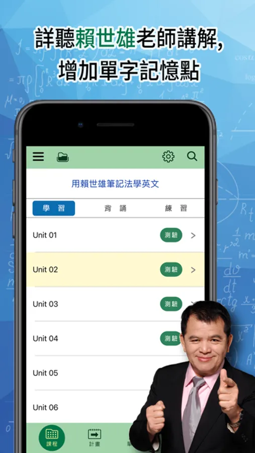 賴世雄老師嚴選720則單字片語親自示範及講解,162段情境對話活用演練,幫助你學好英文,每天10分鐘,提升單字片語記憶力。